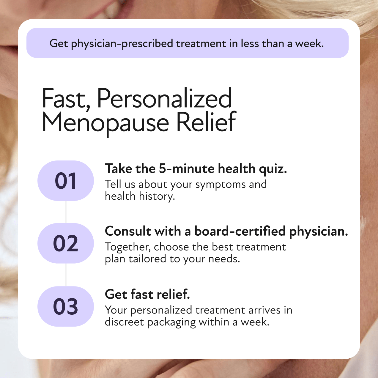 Your treatment (estrogen creams, patches, or capsules) ships directly to your home within about 5 days.